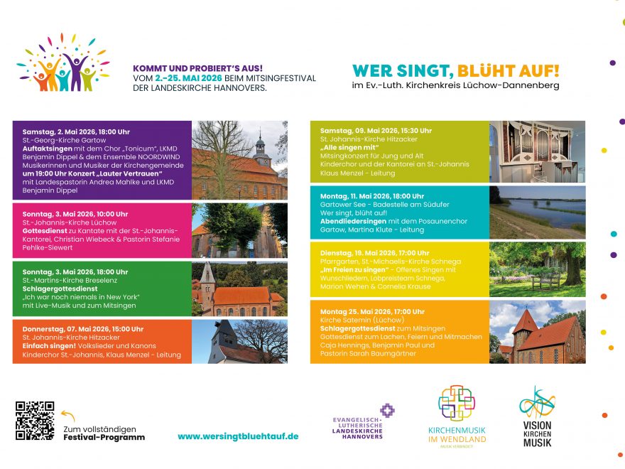 Vom 2. bis 25. Mai findet in der Landeskirche Hannovers das Mitsingfestival unter dem Motto „Wer singt, blüht auf!“ statt. Auch unser Kirchenkreis ist mit einer ganzen Reihe von Veranstaltungen dabei!