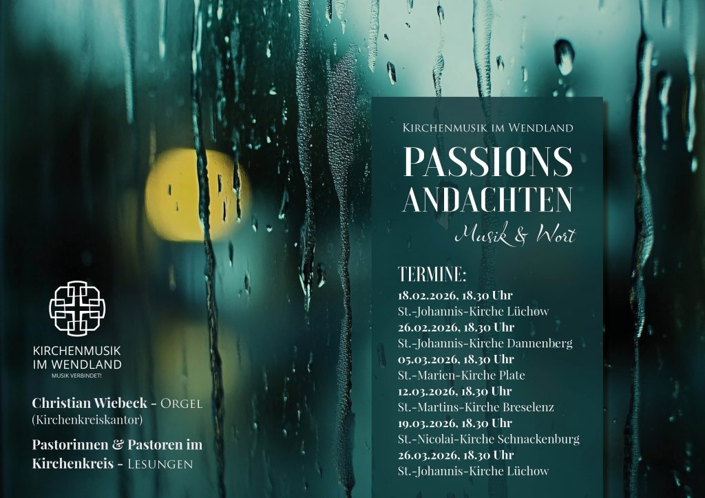 Der Kirchenkreis Lüchow-Dannenberg lädt in dieser Zeit herzlich zu musikalischen Passionsandachten ein. Musik, biblische Texte, Gebete und kurze geistliche Impulse helfen dabei, zur Ruhe zu kommen und die Passionszeit bewusst zu erleben. Gestaltet werden die Andachten von Kirchenkreiskantor Christian Wiebeck gemeinsam mit Pastorinnen und Pastoren des Kirchenkreises.